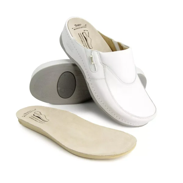 FC10 női Batz papucs fehér színben. A Batz klumpák klasszikus darabja, a manufaktúra “zászlóshajója”, csak jót tudunk mondani róla. Ideális viselet Önnek, ha állómunkát végez, mert estére sem fogja fájlalni lábait. Könnyű viselet, a vajpuha bőr szinte simogatja bőrét, a benne lévő – egyébként könnyűszerrel cserélhető – talpbetét pedig gondoskodik róla, hogy Ön szinte azt érezze, semmi sincs a lábán. Anatómiai kialakítás, hogy minden FC10 tulajdonosa elégedett legyen választásával. Bézs, fehér, kék és piros színekben jár a felsőfokú kényelem.